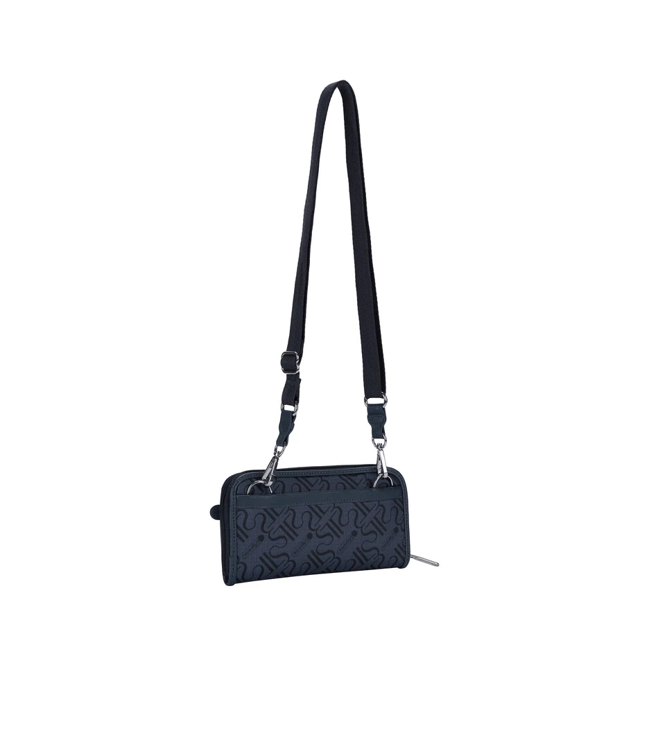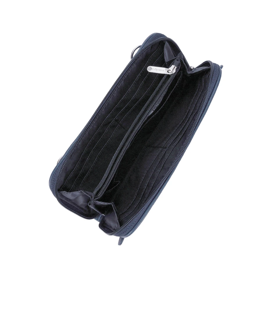 Zip around main closure, Exterior front zip pocket, Exterior back open pocket, Interior features eight total card slots and two full-length bill pockets, Interior center zip closure pocket for coins, Interior open cell phone pocket, Two Interior gusset pockets (to hold receipts, pens or additional paper currency), 0.75/1.9cm wide adjustable/detachable shoulder strap (Max length: 52 in/132 cm, Min length: 29.1 in/ 74 cm), Features faux leather trim details