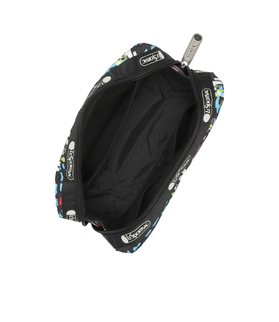Zipped main closure, Interior back wall open pocket, Two interior front wall open pockets