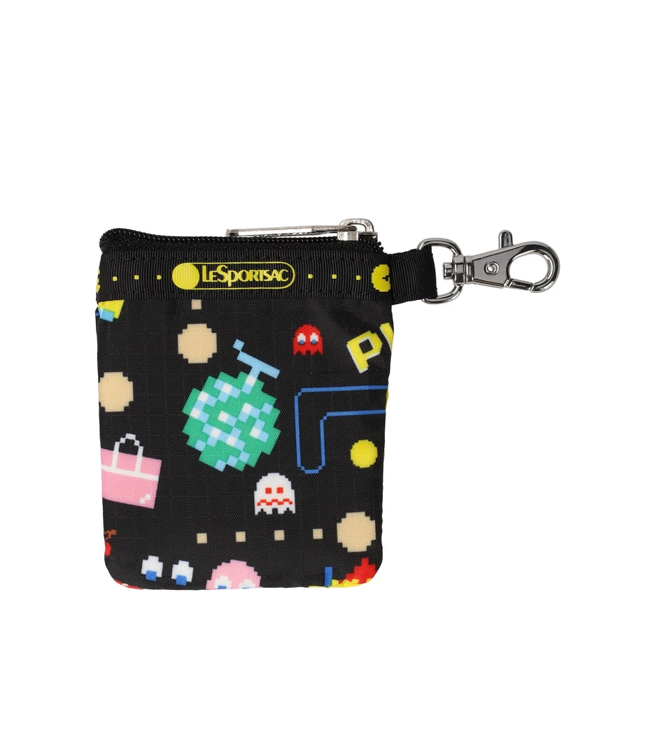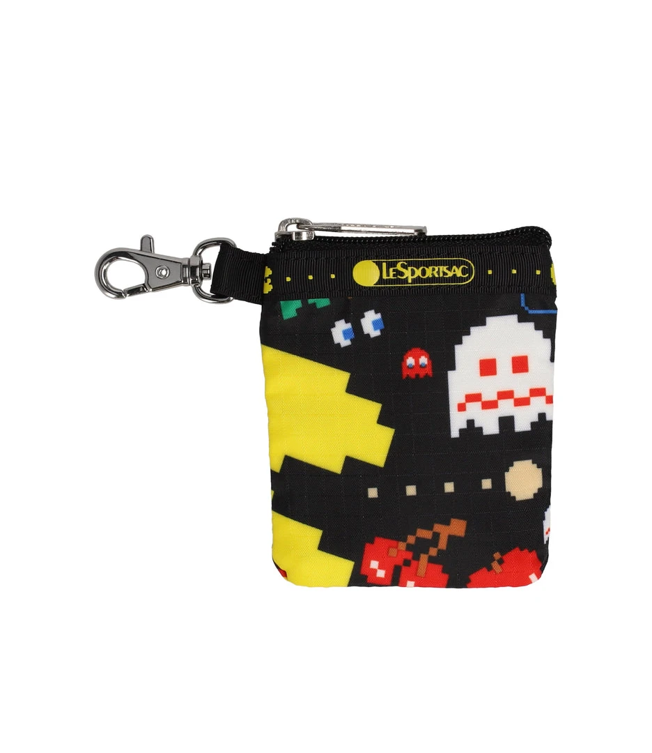 Zip main closure, webbing loop and lobster clasp at exterior left side