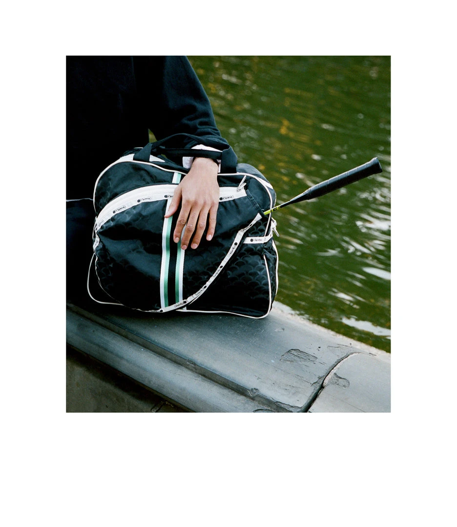 Zipped main closure with dual zipper pulls, Exterior front expandable zip tennis racquet pocket, Two exterior back panel open pockets, Interior front wall with mesh open pocket, Two interior back wall mesh open pockets, Interior side walls with mesh pockets for tennis balls or water bottle, 1.5in/3.8cm wide pinched top handles (Drop: 4 in/10cm, Length: 13.98 in/ 35.5cm, 1.5in/3.8cm wide adjustable/detachable shoulder strap with logo grosgrain details (Max length: 42.12 in/107 cm, Min length: 24.6 in/62.5 cm)