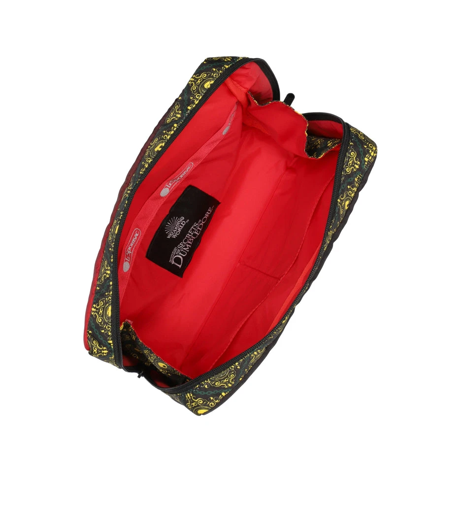 Zip main closure with dual zipper pulls, Interior front wall open pocket, Two interior back wall open pockets