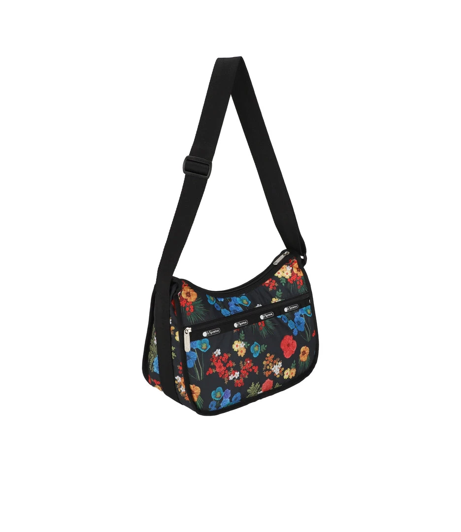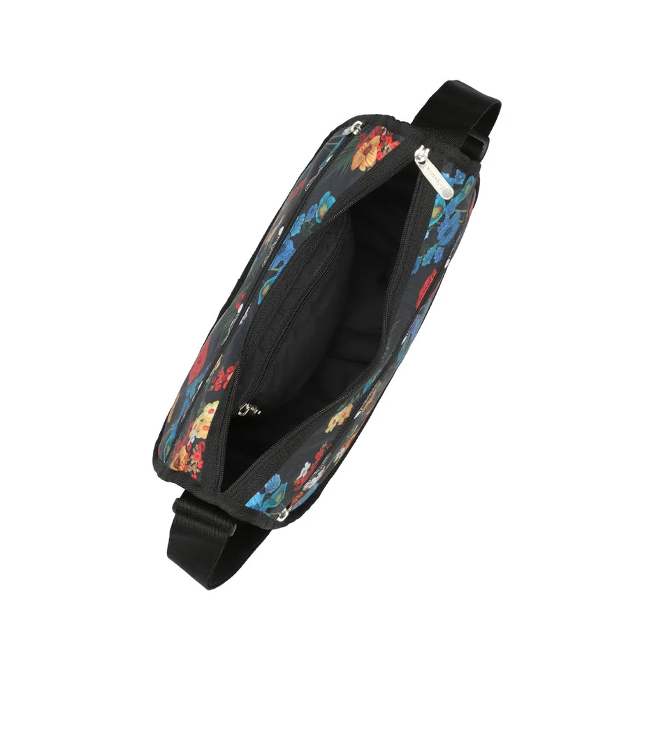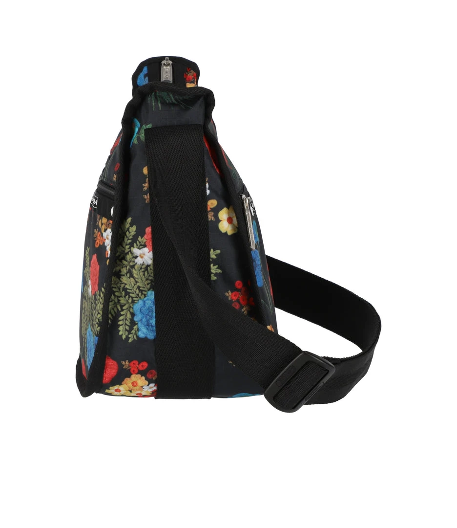 Zipped main closure, Exterior front pocket with zipped closure, Exterior back pocket with zipped closure, Interior back wall hanging zipper pocket, Adjustable shoulder strap (Max. 50in / 127cm), Includes matching pouch with zipped closure