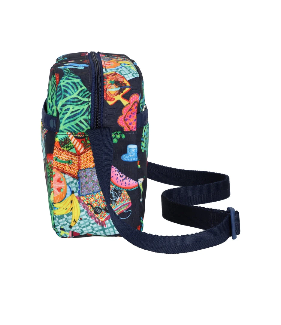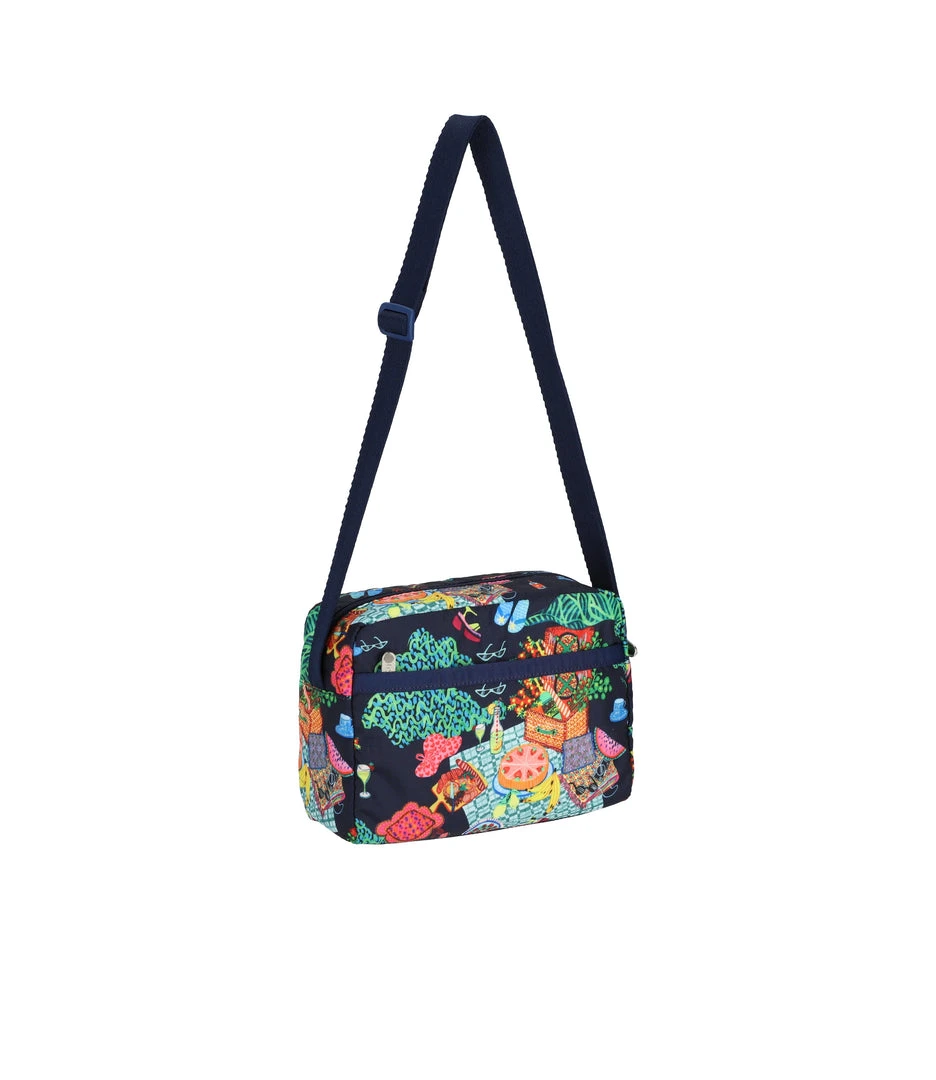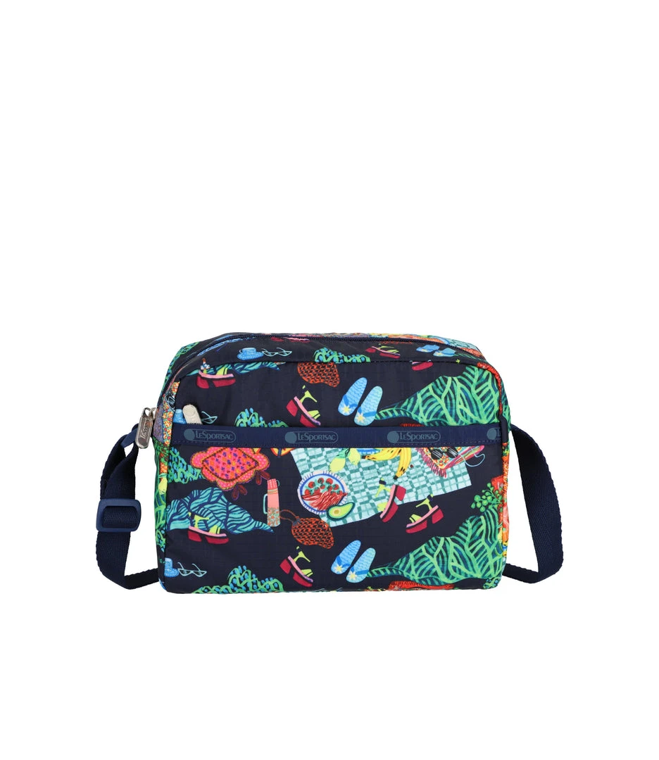 Zip top main closure, Exterior front pocket with zip closure, Exterior back pocket with zip closure, Adjustable crossbody strap (52in/132.08cm), Two interior back wall open pockets, Plastic hardware
