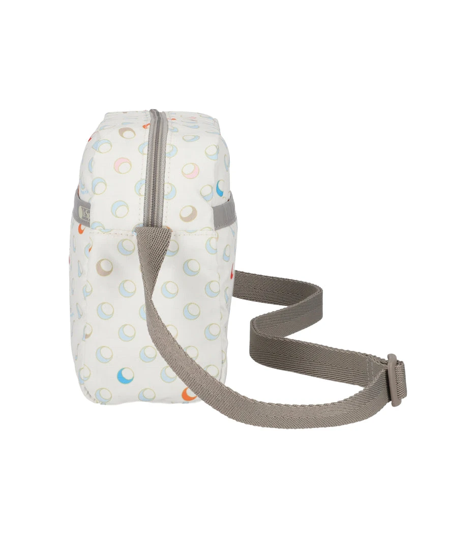 Zip top main closure, Exterior front pocket with zip closure, Exterior back pocket with zip closure, Adjustable crossbody strap (52in/132.08cm), Two interior back wall open pockets, Plastic hardware