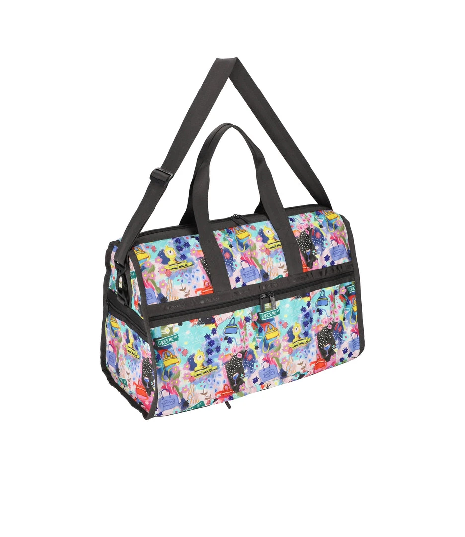 Zip main closure with dual zipper pulls, 8.5in (21.59cm) Top handle drop, 1.5in (3.81cm) Wide adjustable/detachable crossbody strap (Max. 42in/106.68cm), Exterior front panel zipper pocket, Exterior back panel zip closure pocket with dual zipper pulls and a bottom zipper to convert pocket into a sleeve (to slide over rolling luggage handles), Two exterior side pockets with zip closures, Three interior front wall open pockets, Interior back wall combination zip/open pocket