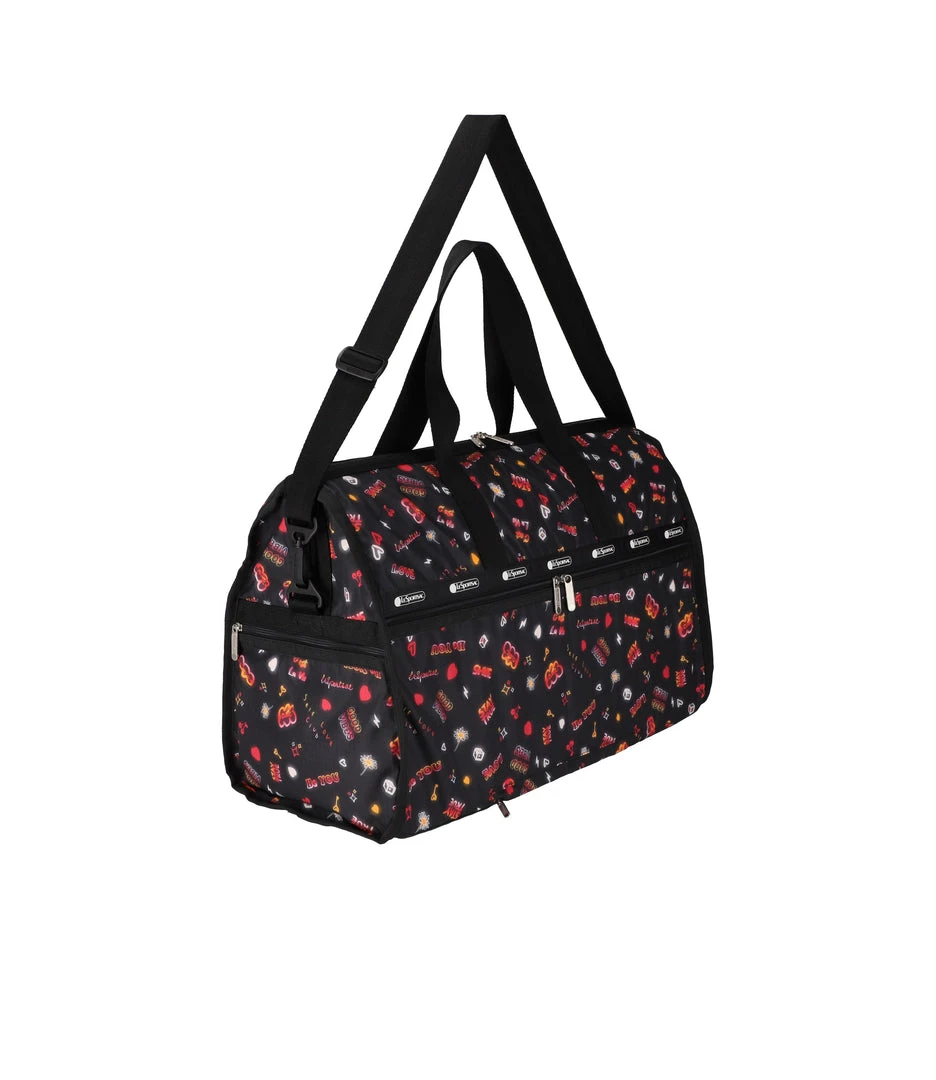 Zip main closure with dual zipper pulls, 8.5in (21.59cm) Top handle drop, 1.5in (3.81cm) Wide adjustable/detachable crossbody strap (Max. 42in/106.68cm), Exterior front panel zipper pocket, Exterior back panel zip closure pocket with dual zipper pulls and a bottom zipper to convert pocket into a sleeve (to slide over rolling luggage handles), Two exterior side pockets with zip closures, Three interior front wall open pockets, Interior back wall combination zip/open pocket