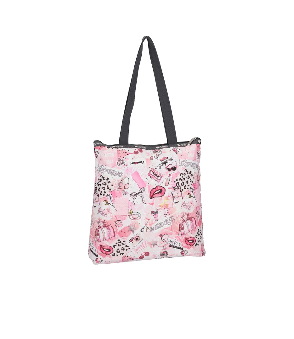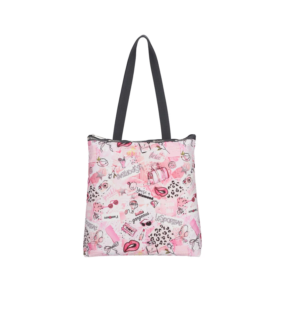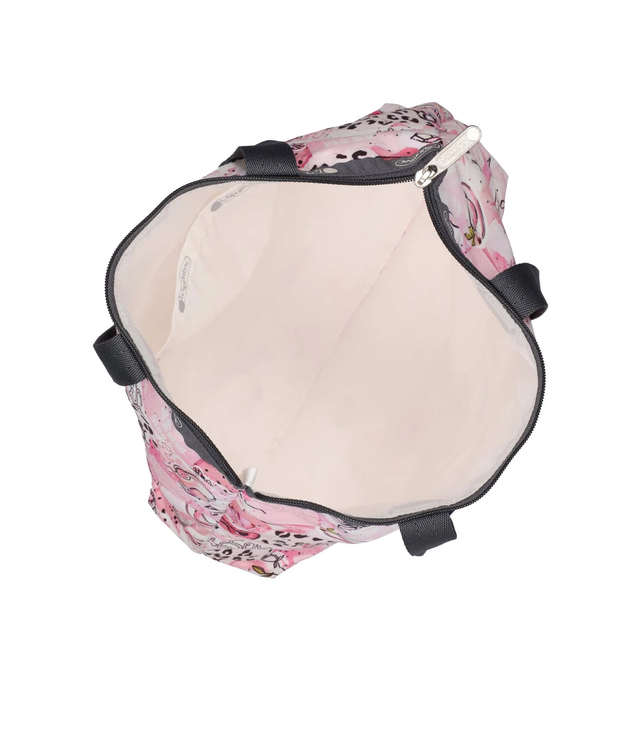 Zipped main closure, 1in (2.5cm) wide top handles (Length: 24.6 in/62.5 cm), Interior back wall combination zip/open pocket