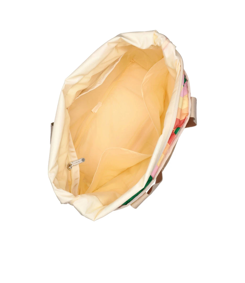 Zip top main closure, Top zipper gusset can be expanded upward for extra interior room (which adds 2in/5.1cm of vertical space), Exterior front small open pocket for phone, Exterior back full-length zip pocket, Two interior front wall open pockets, Interior back wall zip pocket, 1.5in/3.8cm wide pinched top handles (Drop: 11in/27.94cm, Length: 26.37in/67 cm)