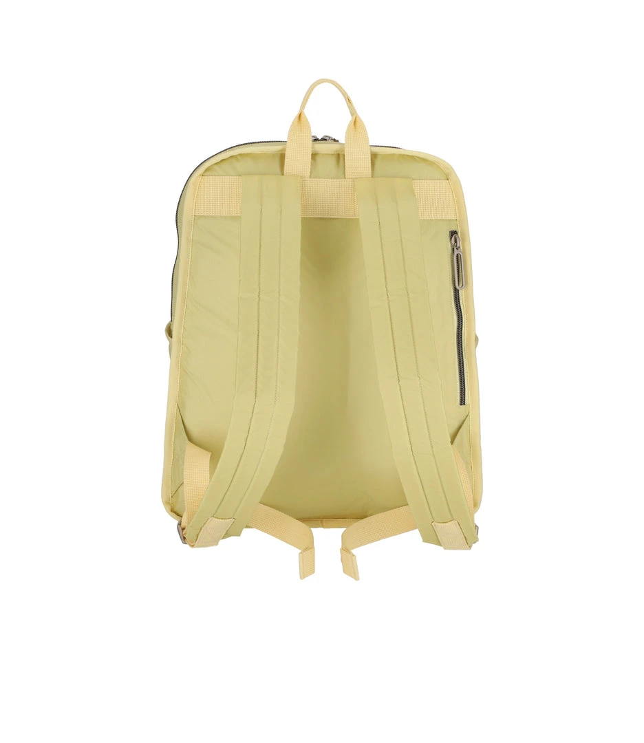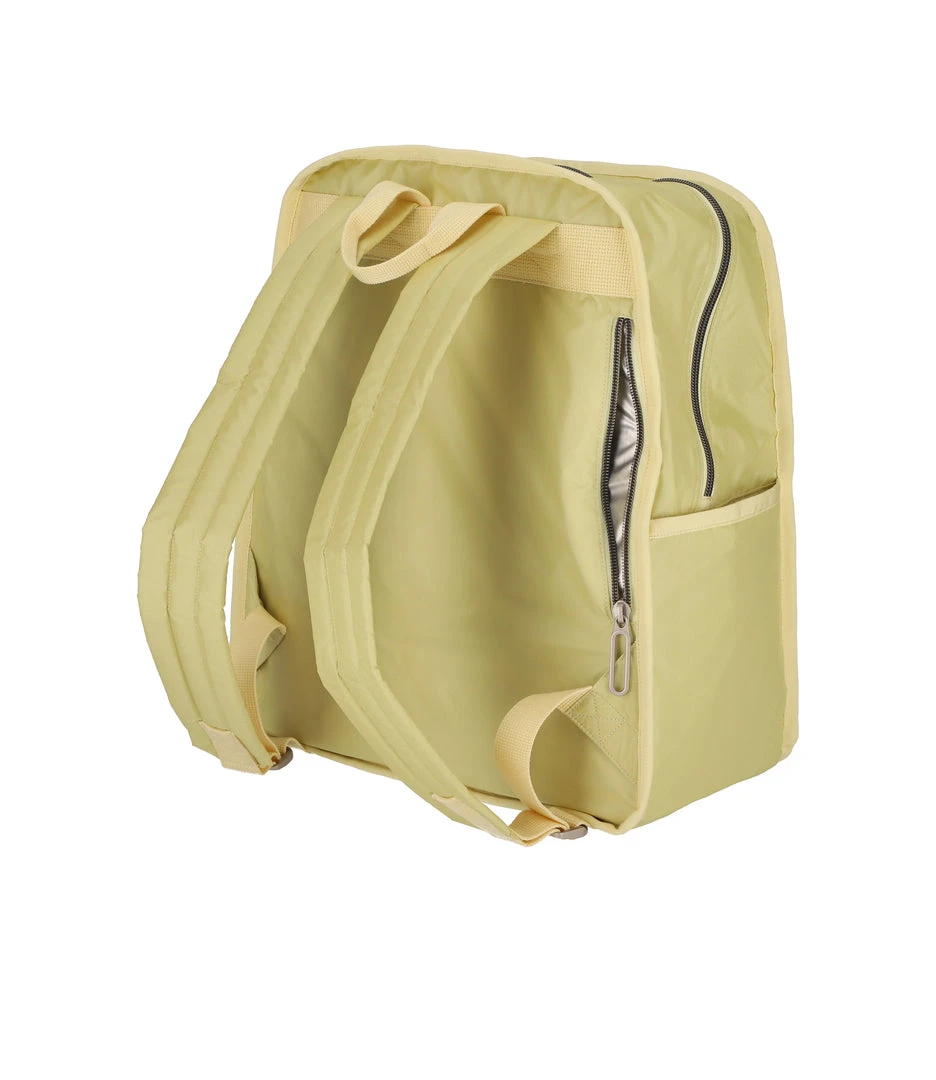 Zip main closure with dual zipper pulls, Adjustable padded shoulder straps, Two exterior front pockets with zip closures, Pinched top loop for hanging, Two exterior side open top pockets for water bottles, Exterior back small zip pocket for phone or wallet, Interior back wall padded laptop pocket with snap closure (fits laptops up to 15in), Interior front wall zip pocket