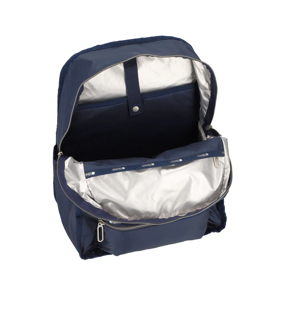 Zip main closure with dual zipper pulls, Adjustable padded shoulder straps, Two exterior front pockets with zip closures, Pinched top loop for hanging, Two exterior side open top pockets for water bottles, Exterior back small zip pocket for phone or wallet, Interior back wall padded laptop pocket with snap closure (fits laptops up to 15in), Interior front wall zip pocket