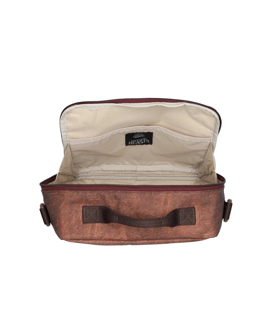 Zip main closure with dual zippers, Exterior back zip pocket, Interior front wall open pocket, Two interior back wall mesh pockets, 1in/2.5cm wide pinched webbing top handle (Drop: 1.57in/4cm, Length: 6.3 in/16cm) , 1in/2.5cm wide adjustable/detachable shoulder strap (Max length: 48.8 in/124 cm, Min length: 25.6 in/65 cm), Includes Fantastic Beasts Luggage ID Tag with an exterior back card pocket with clear window which attaches to the bag with a 0.5in/1.27cm wide strap with a metal snap (Length: 2.36in/6cm)
