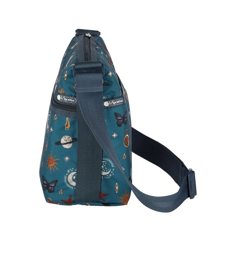 Zip main closure, Exterior front pocket with zip closure, Exterior back open pocket with magnetic snap closure, Two Interior front wall open pockets, Interior back wall features a combination zip/open pocket and a larger open pocket, 1.5 in/3.8cm wide adjustable shoulder strap (Max length: 53 in/134.5 cm, Min length: 30.3 in/ 77 cm)9.25H x 9.25W x 4.5D in, 23.5H x 23.5W x 11.5D cm