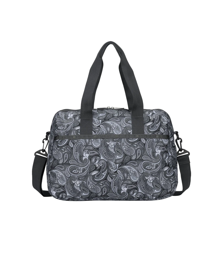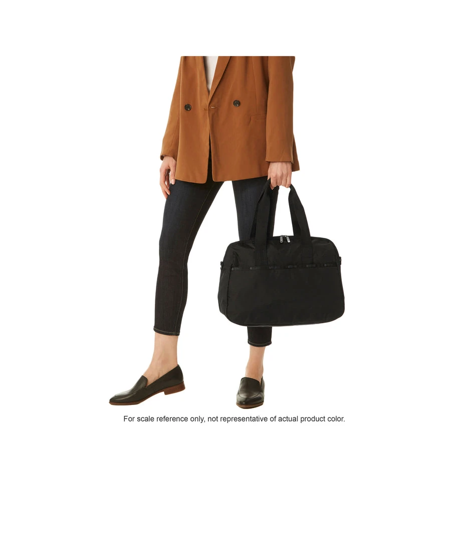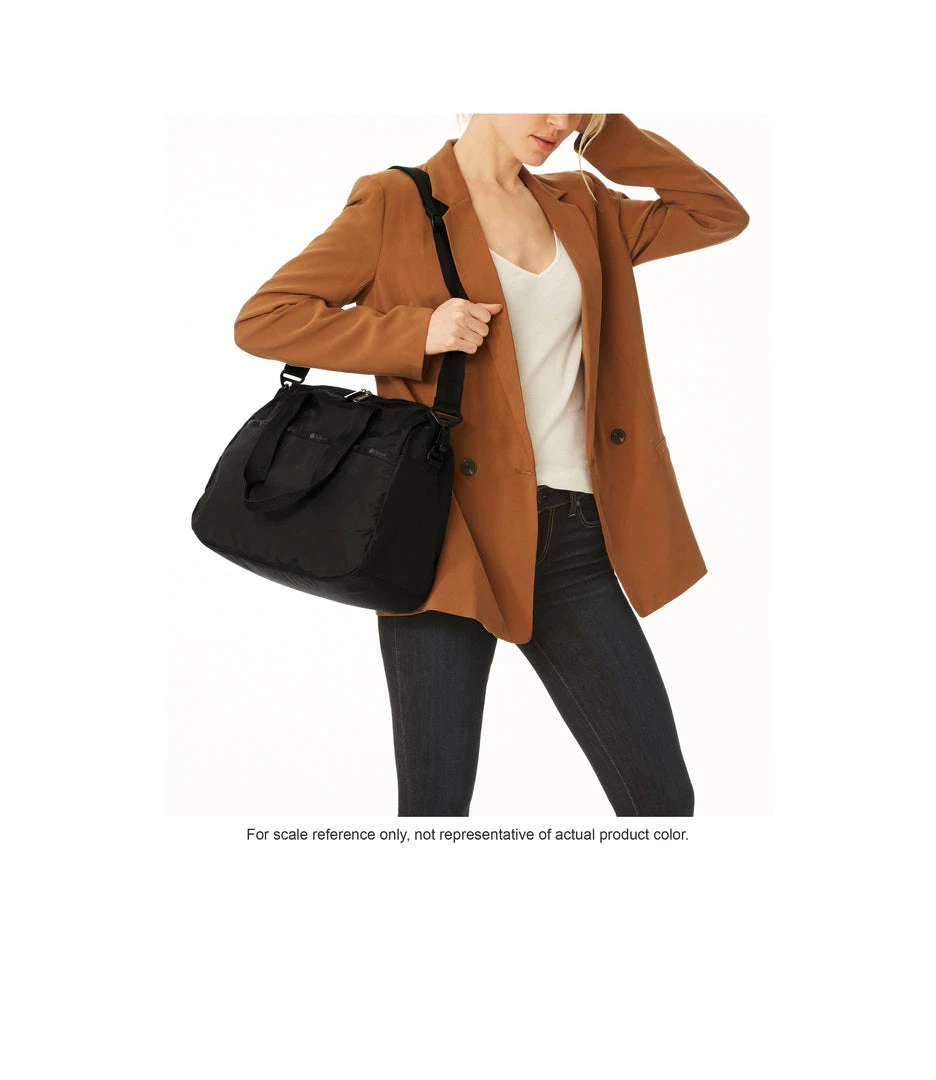Zip main closure with dual zipper pulls, 8.5in (21.59cm) Handle drop, Exterior front pocket with zip closure, Exterior back pocket with bottom zipper to convert into a sleeve (to slide over rolling luggage handles), Adjustable/detachable shoulder strap (Max. 51.5in/130.81cm) with plastic hardware, Interior front wall zip closure pocket, Interior back wall laptop compartment (fits laptops up to 15in)