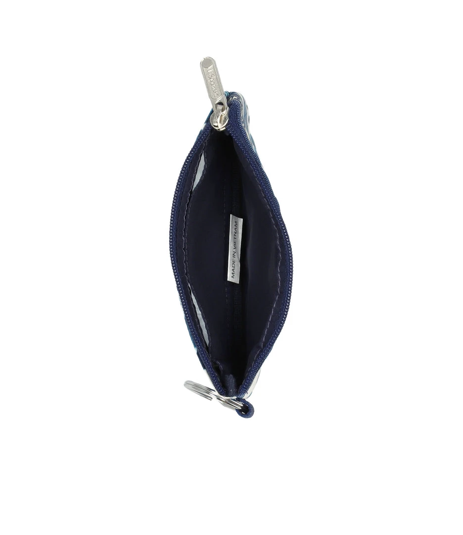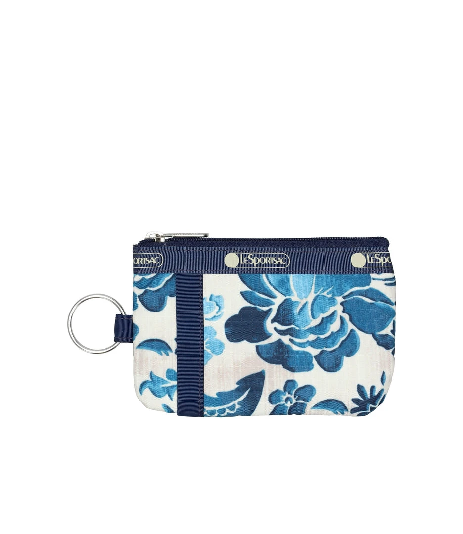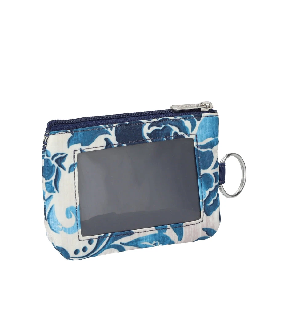 Zip top main closure, Exterior front open pocket, Clear ID window on back panel, Metal key ring