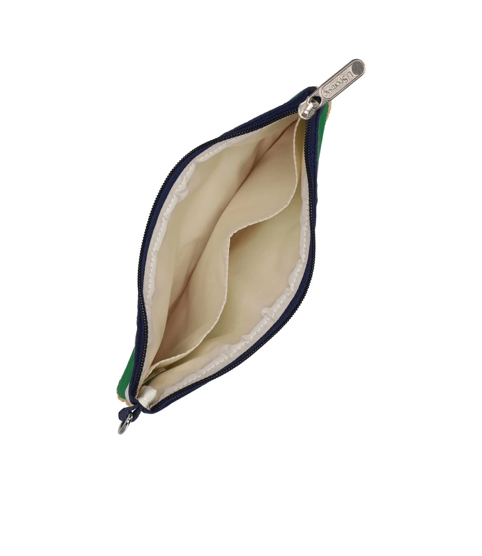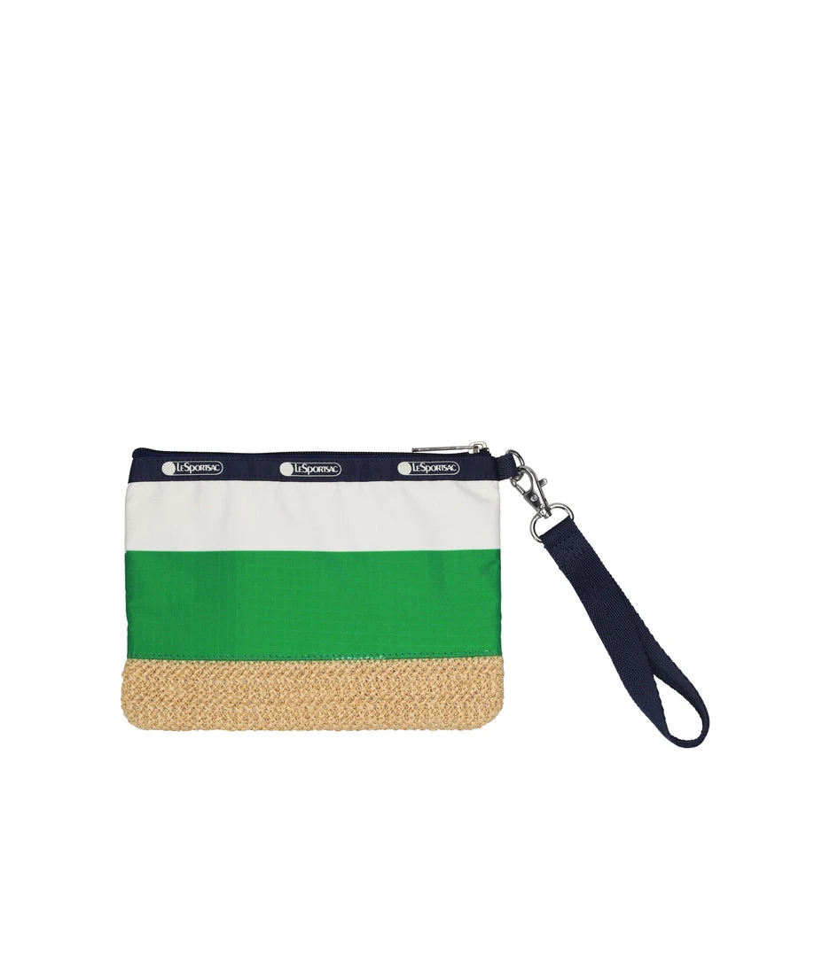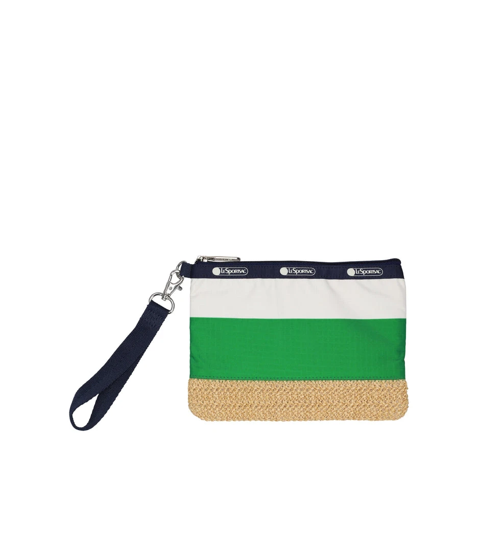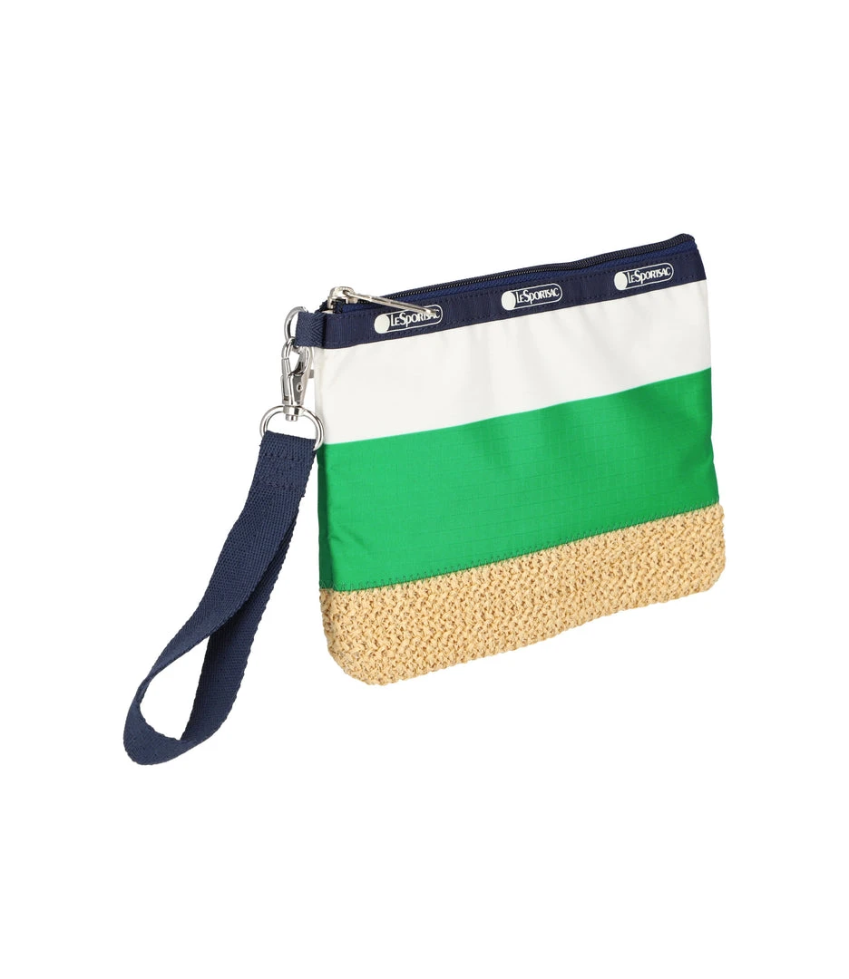 Zip main closure, Interior back wall open pocket, Loop and D ring on exterior left side with a 0.75in/1.9cm wide detachable wristlet strap(Length: 5.8 in/14.8 cm)