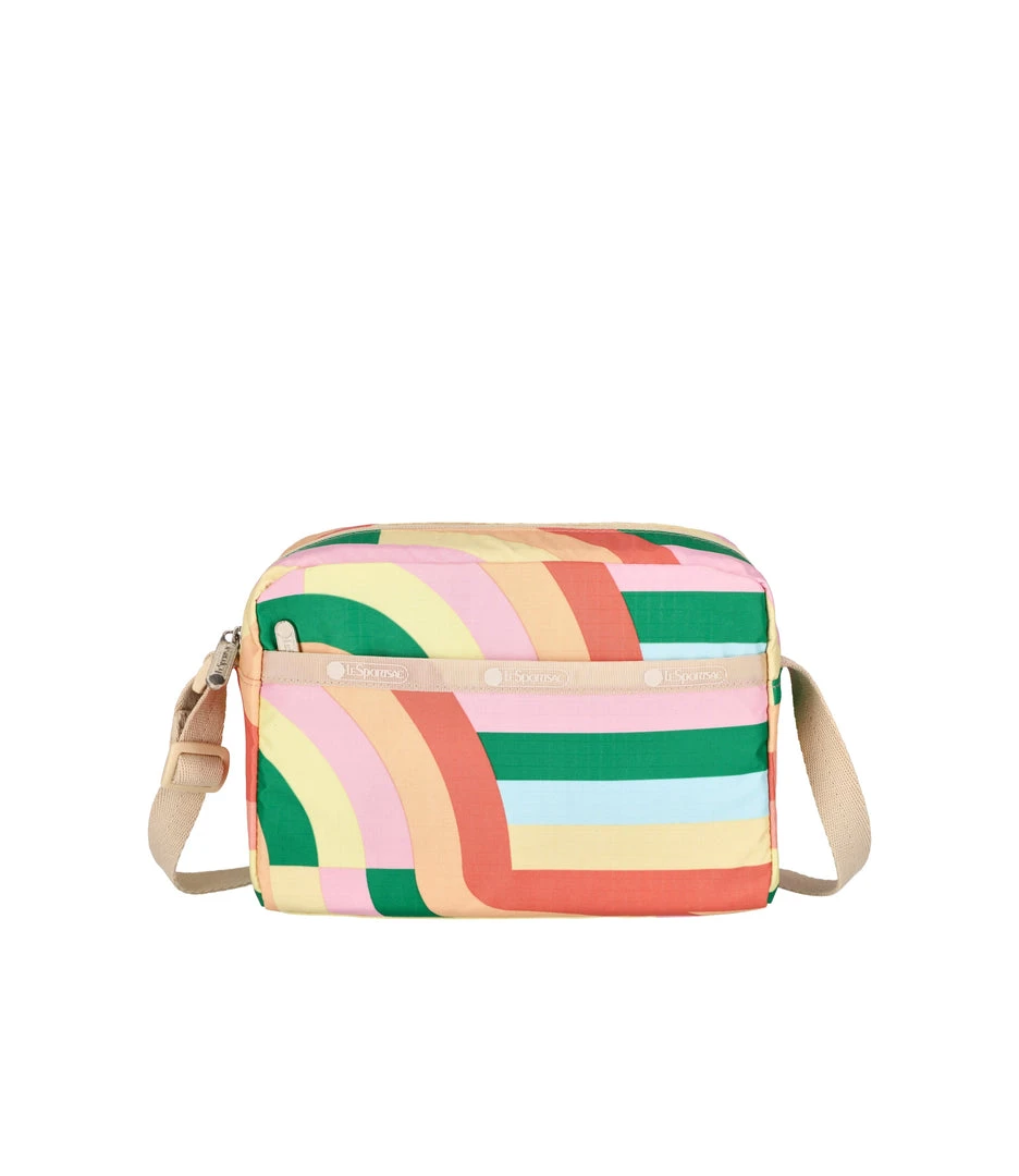 Zip top main closure, Exterior front pocket with zip closure, Exterior back pocket with zip closure, Adjustable crossbody strap (52in/132.08cm), Two interior back wall open pockets, Plastic hardware
