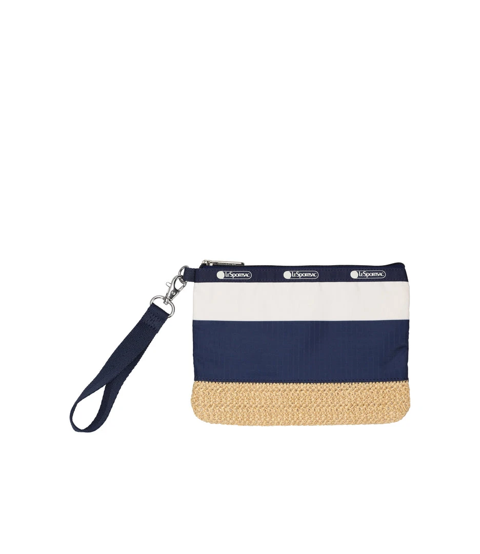 Zip main closure, Interior back wall open pocket, Loop and D ring on exterior left side with a 0.75in/1.9cm wide detachable wristlet strap(Length: 5.8 in/14.8 cm)