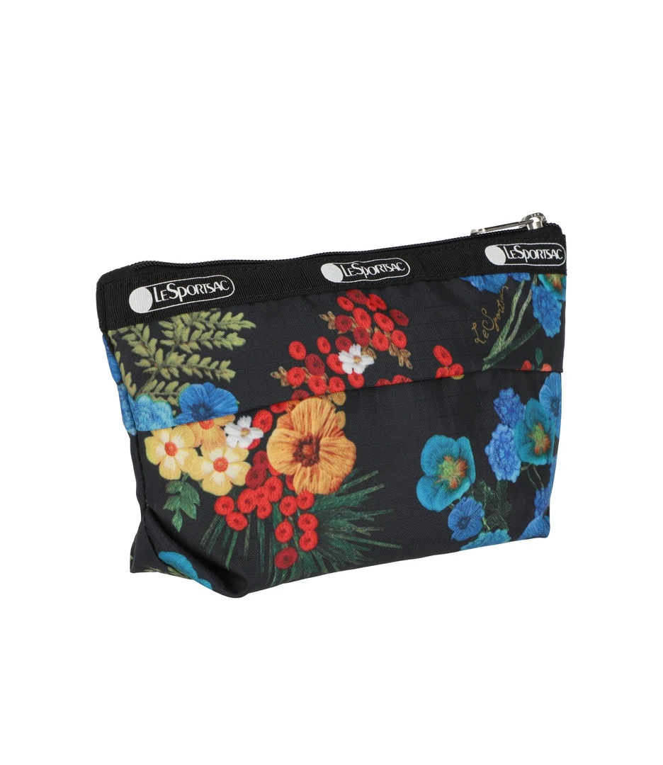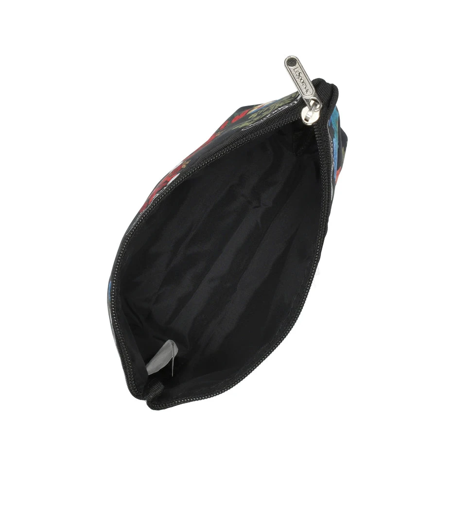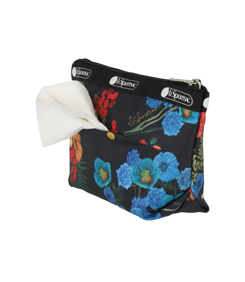 Zip top main closure, Exterior back panel tissue pocket (tissues not included)