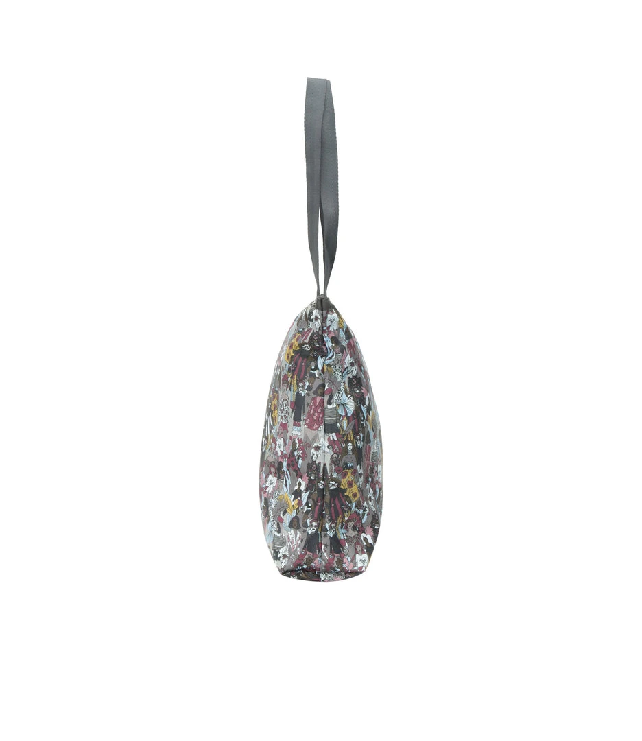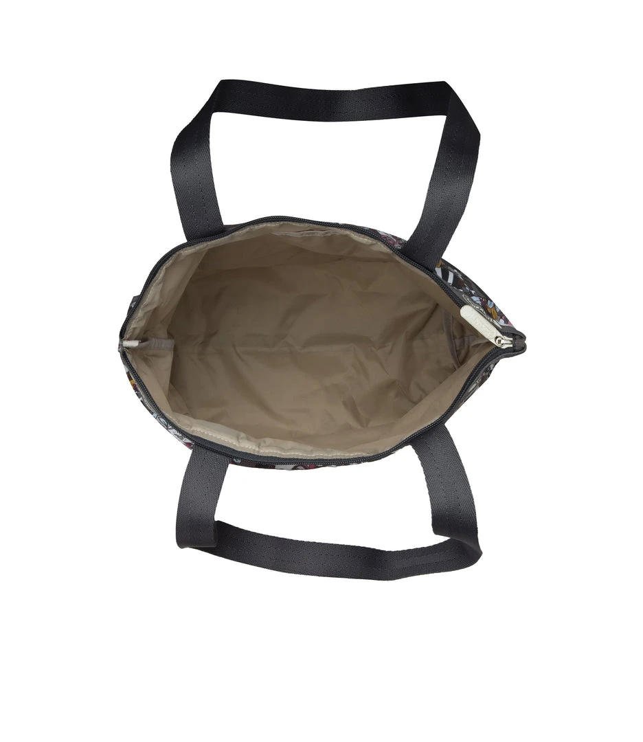 Zipped main closure, 1in (2.5cm) wide top handles (Length: 24.6 in/62.5 cm), Interior back wall combination zip/open pocket